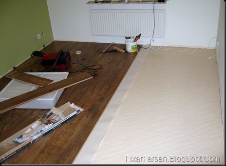 Sedan lade jag samma mörkbruna laminatgolv från Byggmax med struktur (som ligger på hela övervåningen) direkt över plastmattan med lite “foam” i mellan.